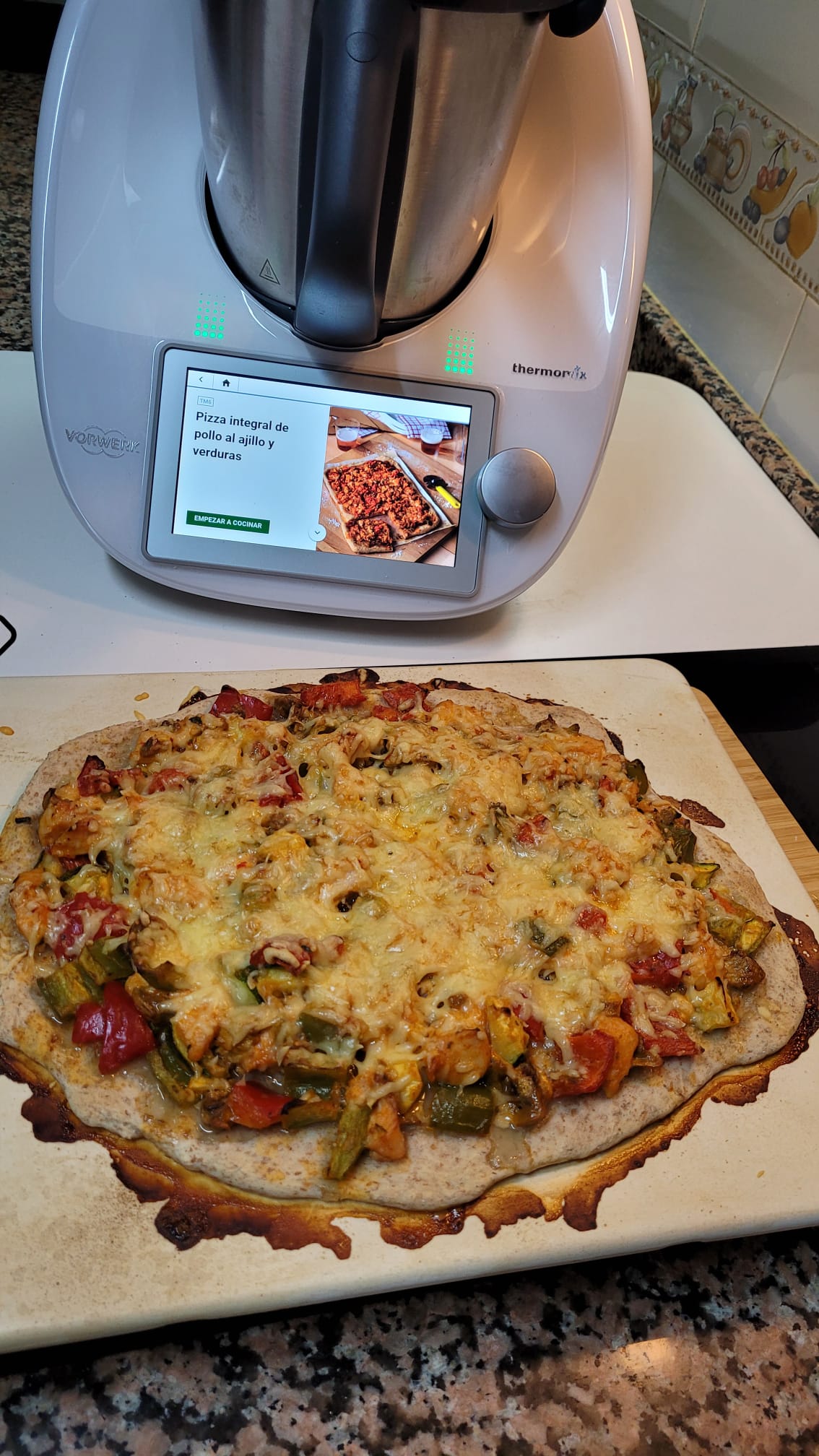 EN EL DIRECTO DE HOY DE LA DELEGACIÓN DE THERMOMIX DE MATARÓ , HE HECHO UNA DELICIOSA PIZZA INTEGRAL , CON VERDURAS Y POLLO AL AJILLO ... DELICIOSA ( NO ME HE PODIDO CONTENER ) .