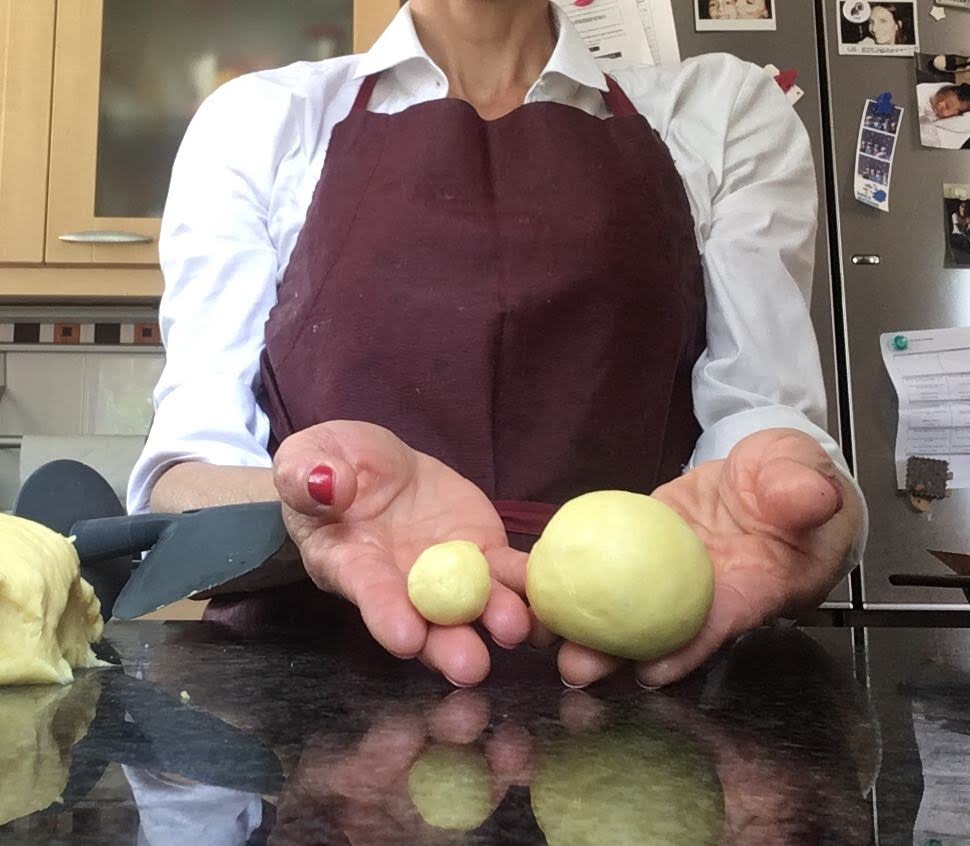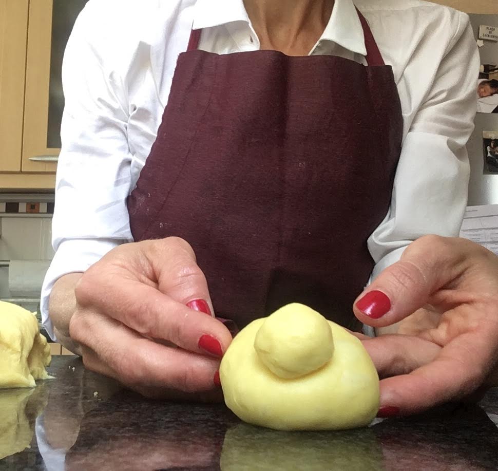 6- Una vez doblada la masa la abocamos en la encimera y cortamos unos trozos de 60 gr (aprox.) y los boleamos con la mano a forma de cuchara empujando la masa en la encimera para estirar la superficie y darle forma de bolita. poner la bola encima de 2 zafatas de horno recubiertas con papel vegetal y siguiendo la misma tecnica preparar bolitas de unos 15 gr para hacer el "tuppo" y ponerlos encima de la bolas grandes, apretando primero con el dedo desde arriba para que las bolitas pequeñas encajen bien.