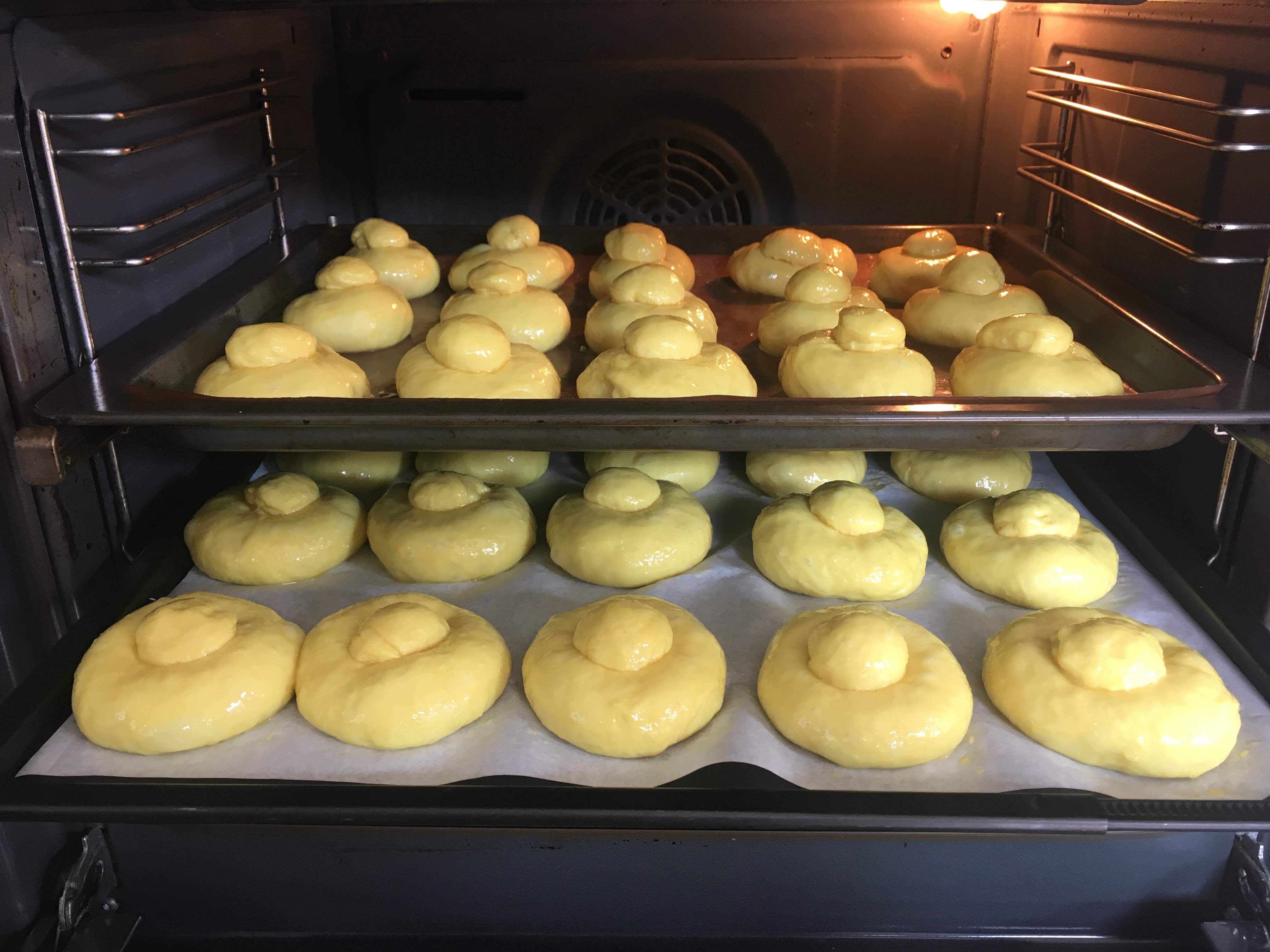 8- Pintar los Brioches con la yema batida con la leche y dejar doblar los brioches poniendo las zafatas dentro del horno apagado y con luz encendida.