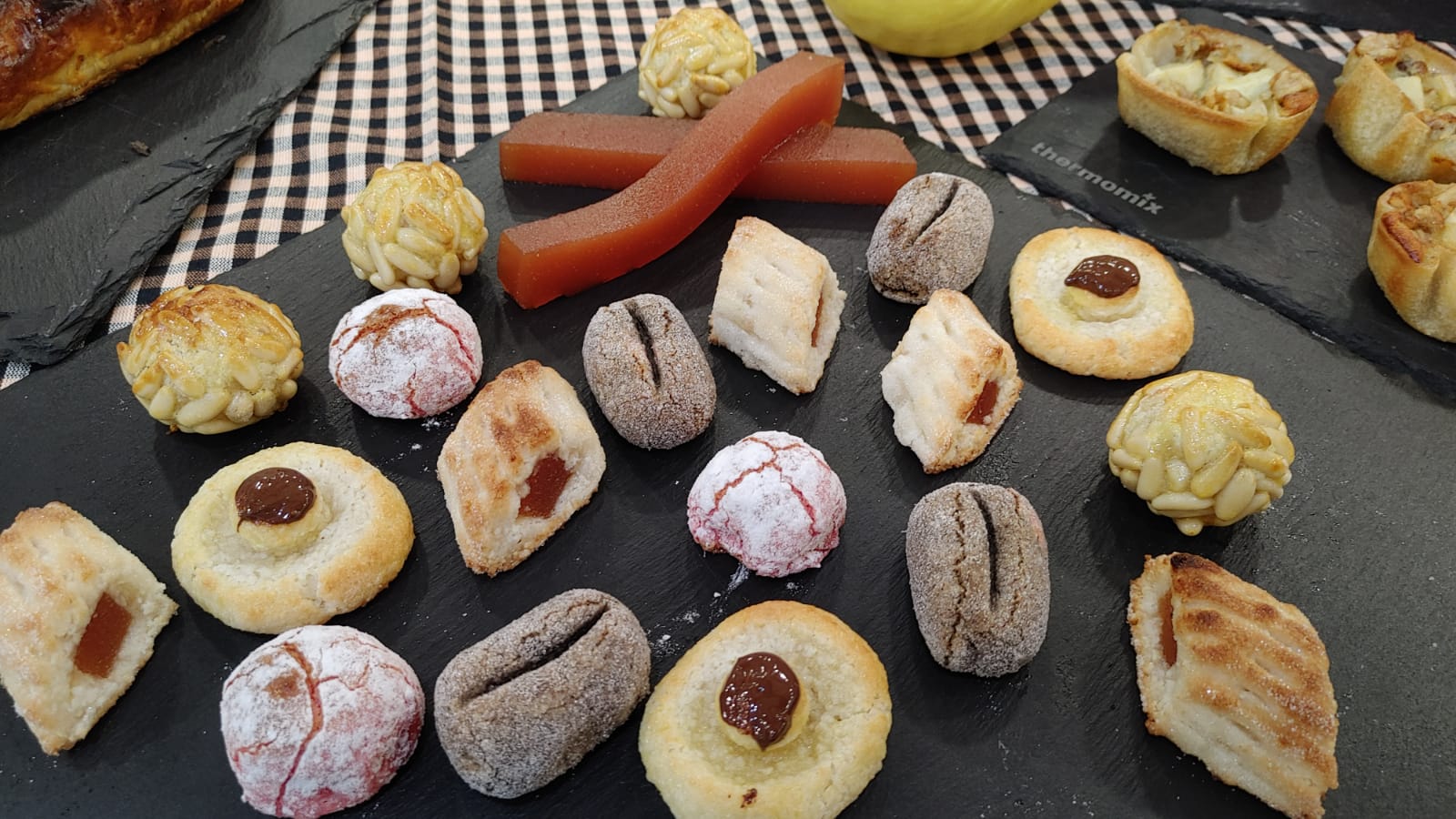 3. Pincele los panellets de piñones y las setas con la yema de huevo batida. Los de membrillo y café con azúcar y los de color y aroma con azúcar glaç. Hornee la bandeja durante 5/6 minutos (220°C) en la parte alta del horno, hasta que estén dorados. Vigilarlos mucho, cada horno va distinto, no se deben cocer, solo tostar y poco. Retire del horno y deje enfriar antes de servir.