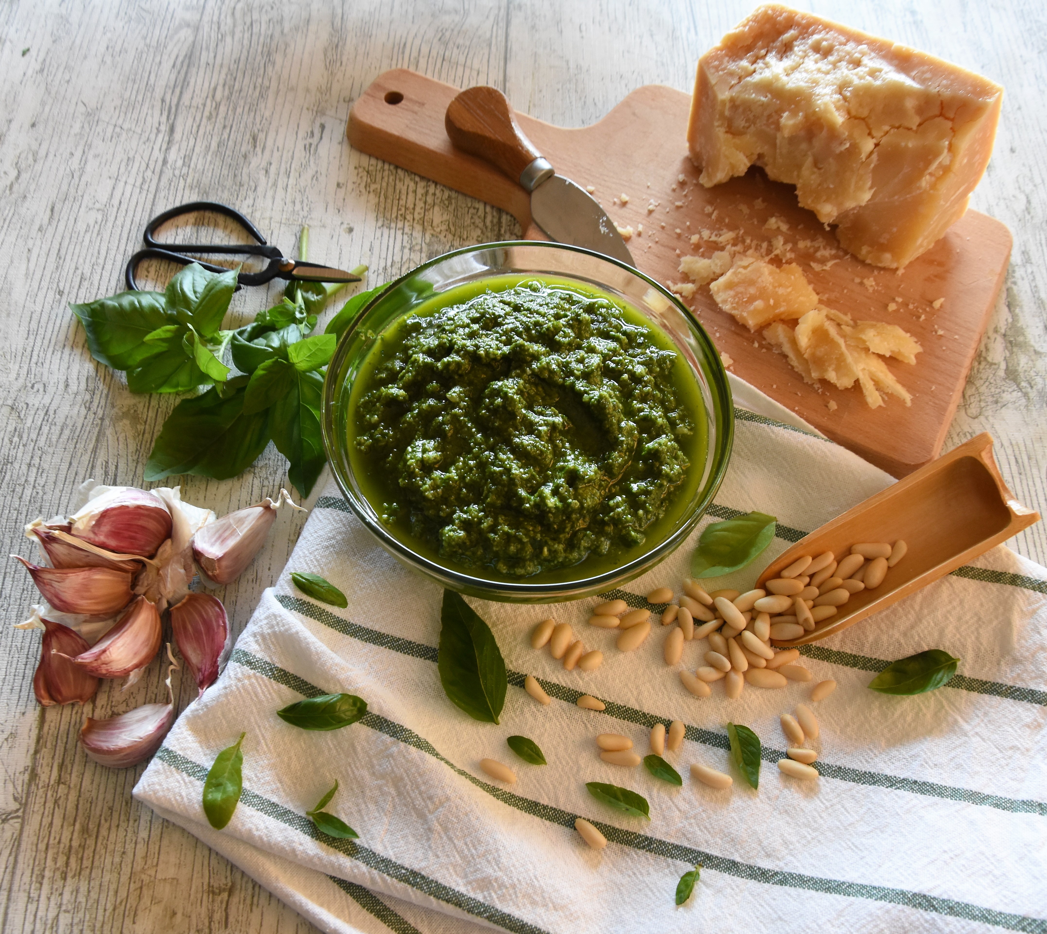 Abans que no la pugui aprofitar per a res, em decideixo a fer la salsa pesto i posar-la en pots per poder-ne gaudir durant tot l'hivern. També he aprofitat els pinyons que he trencat a cops de martell i amb l'ajuda d'una pinça d'estendre la roba durant tot l'estiu.